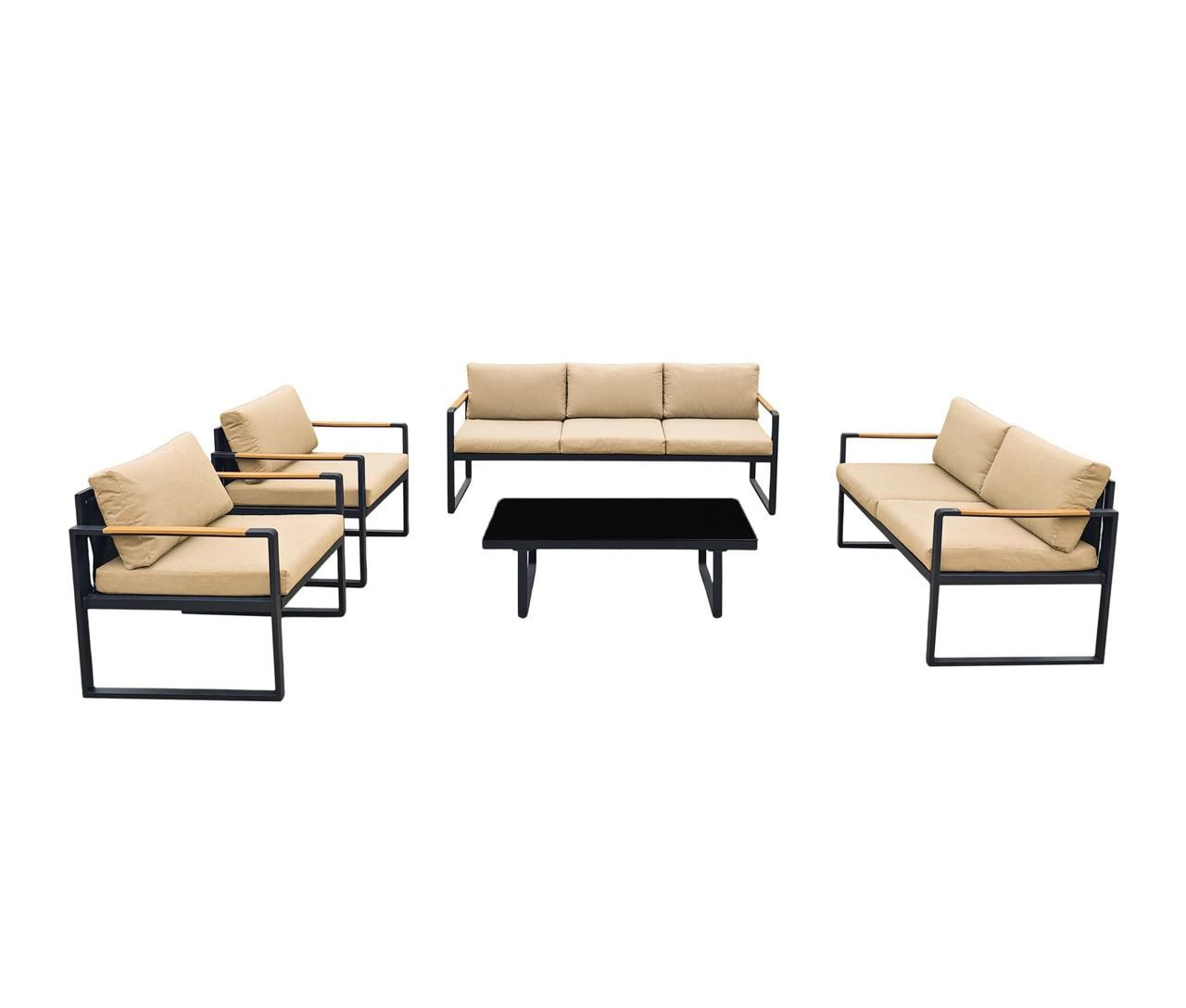 استمتع بأجواء الهواء الطلق مع هذا الطقم الخارجي الفاخر، الذي يجمع بين الأناقة والراحة بفضل تصميمه العصري والجودة العالية لمكوناته. يتميز الطقم بإطار معدني قوي باللون الأسود، مع وسائد ومساند بنية ناعمة توفر أقصى درجات الراحة أثناء الجلوس.